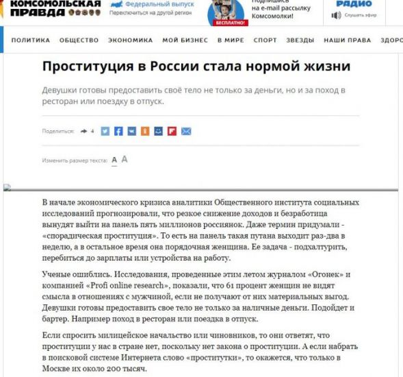 Если бы я сказал а-ля "Большинство девушек сегодня именно проститутки", то было бы очень легко отмахнуться, подумав или написав "да это у тебя так". Но нет, тут я могу вам скриншотик выложить, где вполне профессионально провели исследование и установили что 61% россиянок признались что они проститутки. То есть не у одного меня такое мнение сложилось.
