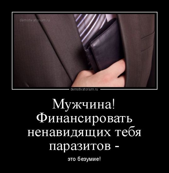 Как оценить услуги мужчин в браке в качестве шофёра, охранника, сантехника, мебельщика, психолога и прибивателя полок? Ладно, допустим они компенсируются услугами «некухарки, не служанки, не уборщицы, не проститутки». Ладно! Упомянем материнский (семейный) капитал – 0,6 миллиона, декретные, бесплатное медобслуживание по ОМС при родах – всё это идёт из госбюджета т.е. тех же совокупных мужских на 3/4 денег. В итоге, что мы имеем? Мы получаем сумму в 5-10-15 и более миллионов чистой женской выгоды от брака! А как говорил Ломоносов: «Если в одном месте прибыло, то значит в другом месте убыло!» А убыло из ваших мужских карманов! При этом речь идёт о самых рядовых мужчинах-середнячках! Которые и миллион в одном месте в глаза не видели! Что касается богачей, их грабят больше на порядки!